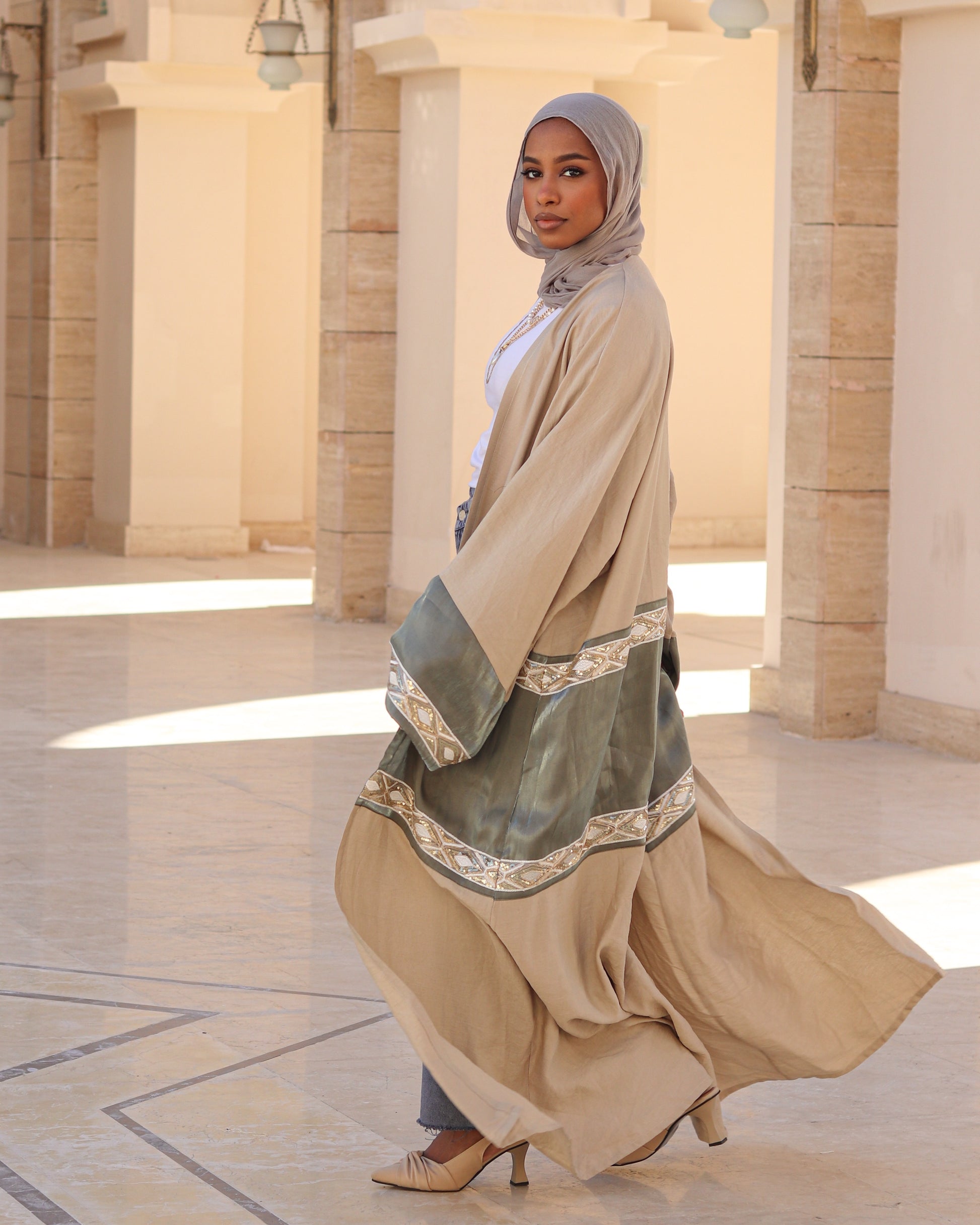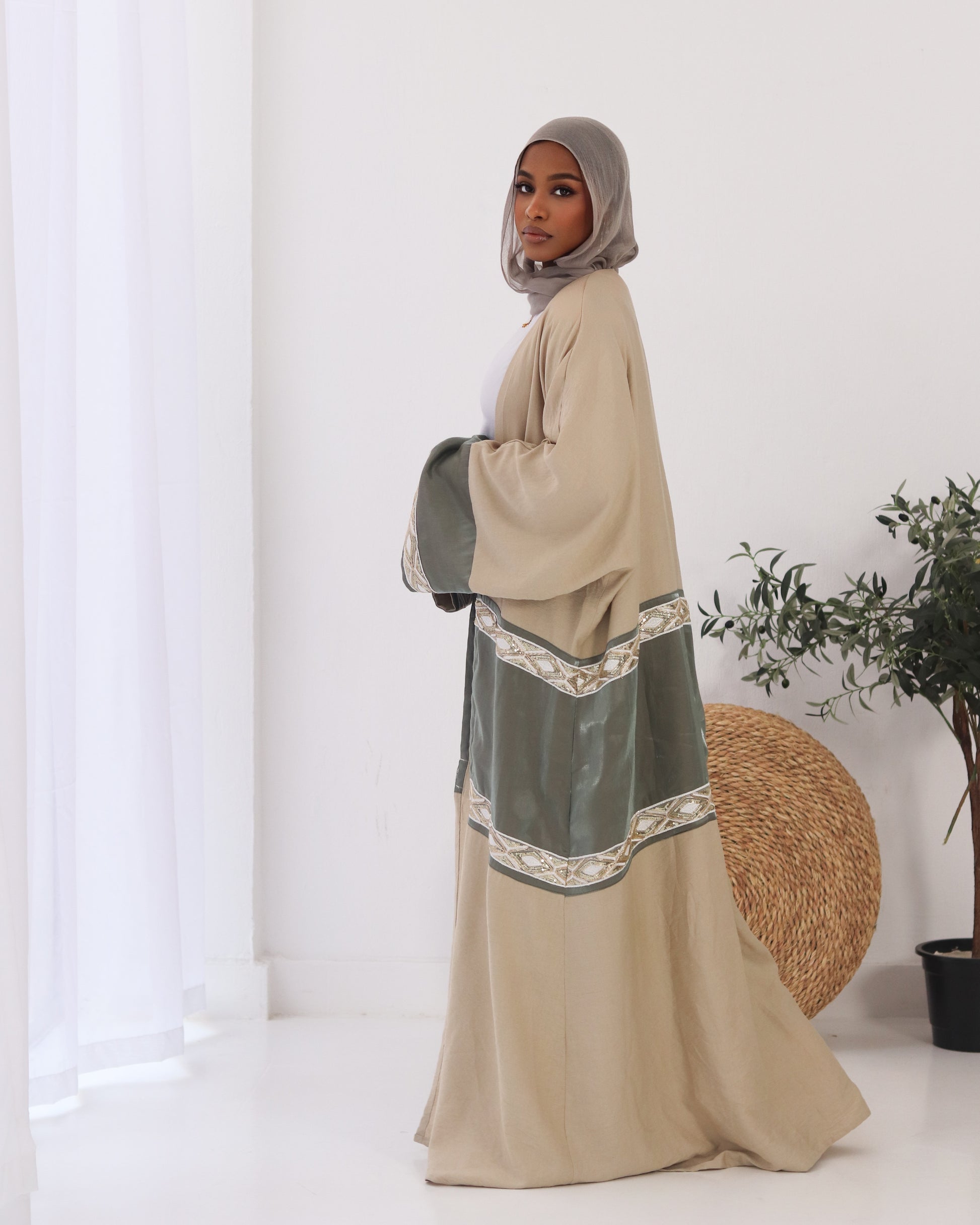 beige linen with olive green organza